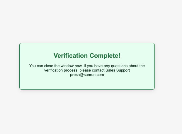 Once you see the “Verification Complete!” message below, you are DONE. Your Recheck account has successfully been connected to Sunrun.