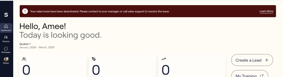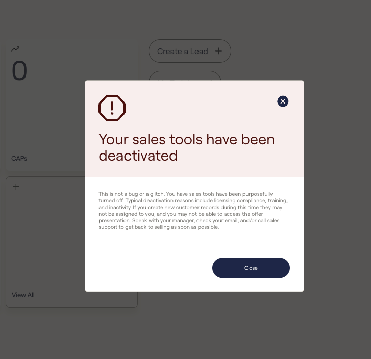 Reps who have been deactivated will see the below messages in the One App platform: